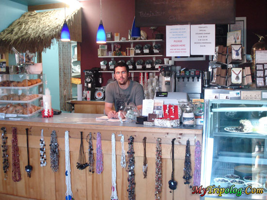 (Inside the Island Perks Cafe & Restaurant, Buxton, Cape Hatteras, NC; That’s “Register Fatih“! you can see some homemade cakes on the right side and souvenirs, coffees etc.)