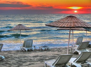 kusadasi beach and sunset over the aegean sea