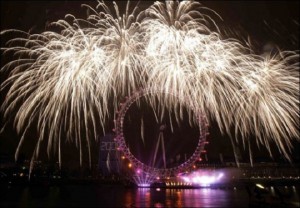 Ferris Wheel at New Year time, London fireworks, England