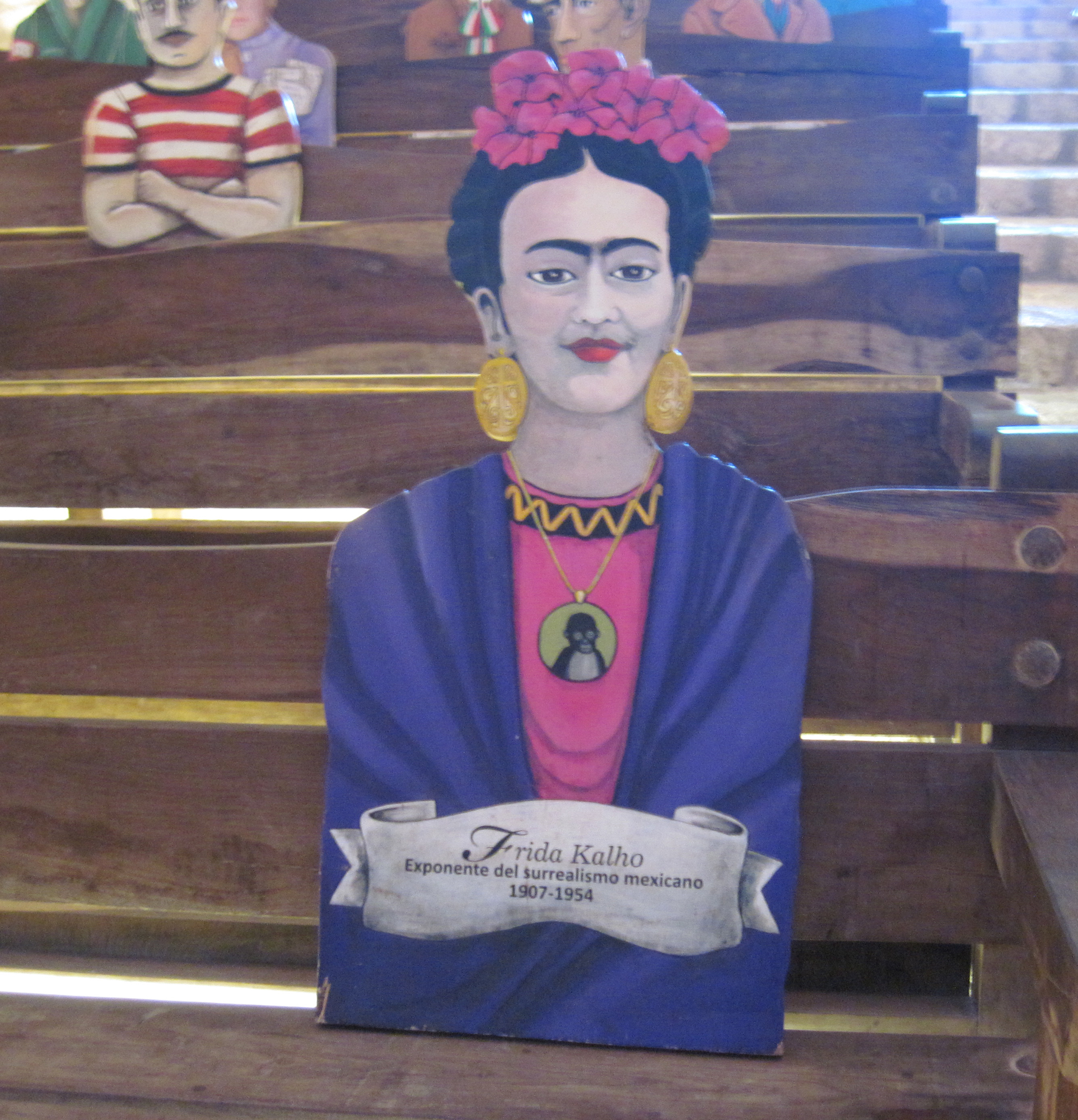 (Frida Kalho sitting on the benches of Lady Guadalupe Chapel, Xcaret Park, Mexico)
