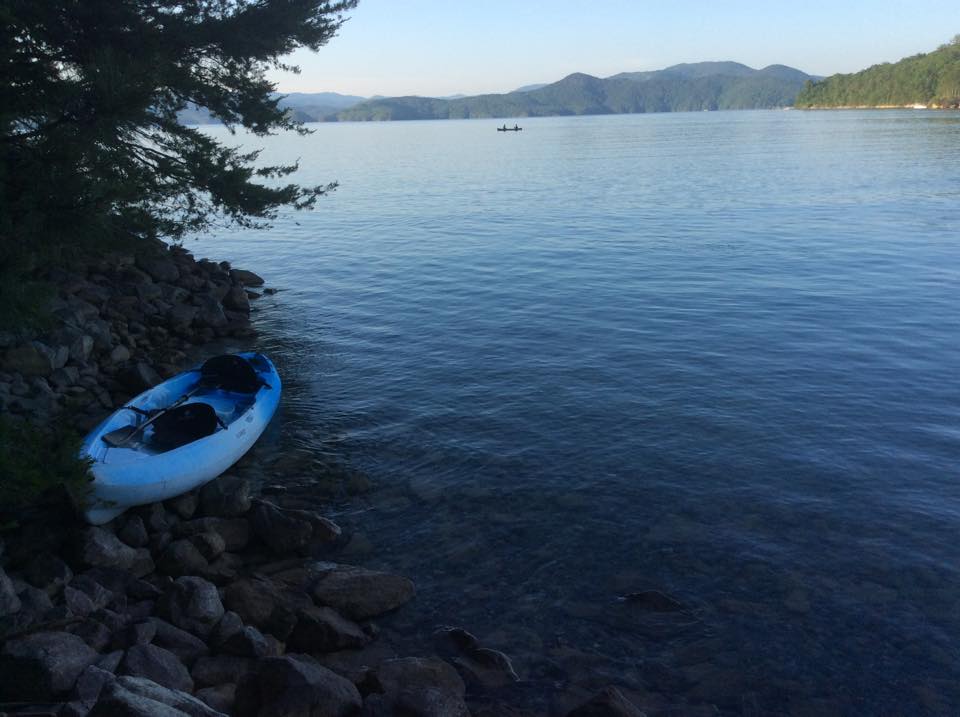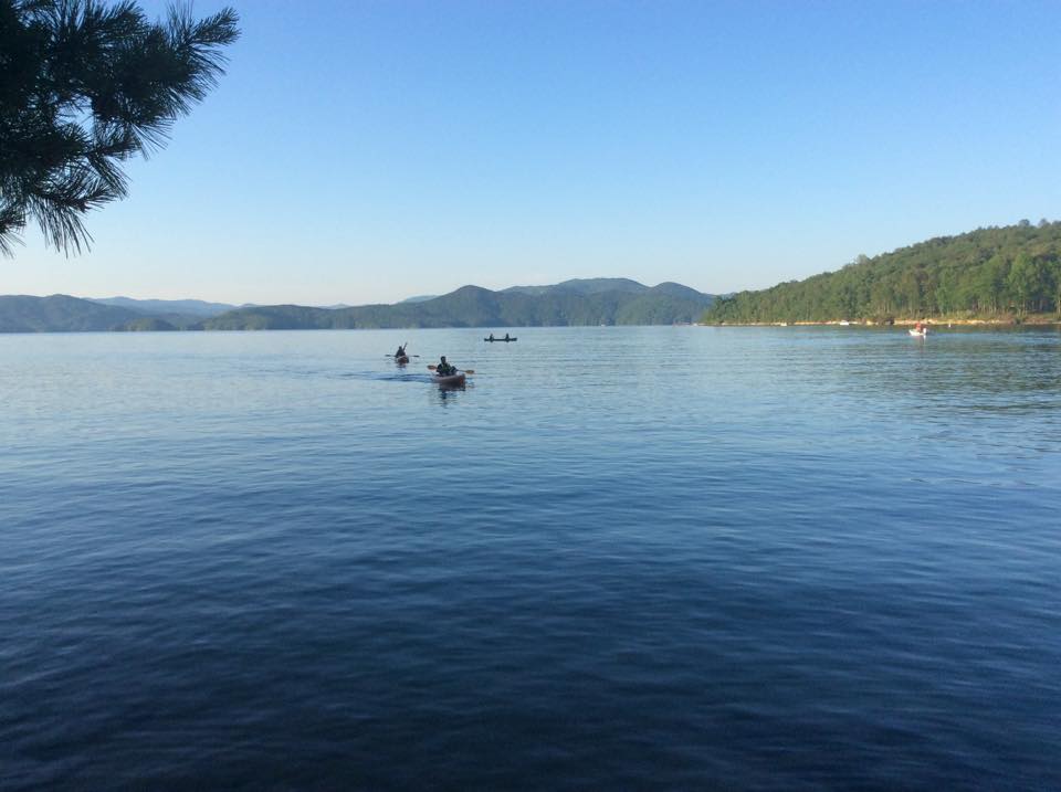 ( Kayaking tourists on Lake Jocassee. Kayaks could be rented in the area; I don’t remember the exact price but it was something around 15-20 bucks for an hour.)